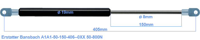 Erstatningsgassfjær for Bansbach A1A1-50-150-406--0XX 50-800 Newton. Øyet har en tykkelse på 5mm og en hulldiameter på 8.1mm. Merke: Hahn.