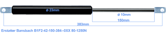 Erstatningsgassfjær for Bansbach B1F2-42-150-384--0XX 80-1250 Newton. Øyet har en tykkelse på 10mm og en hulldiameter på 8.1mm. Merke: Hahn.
