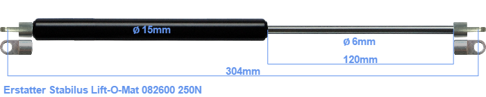 Erstatningsgassfjær for Stabilus Lift-O-Mat 082600 0250N. Øyet har en tykkelse på 3mm og en hulldiameter på 6.1mm. Merke: Hahn.