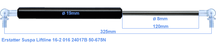 Erstatningsgassfjær for Suspa Liftline 16-2 016 24017B 50-675 Newton. Dette passer en (eventuelt allerede er der) ball med diameter på 10mm. En tilsvarende ball er inkludert. Merke: Hahn.