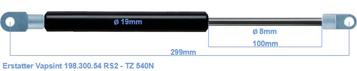 Erstatningsgassfjær for Vapsint 198.300.54 RS2 - TZ 540 Newton. Øyet har en tykkelse på 5mm og en hulldiameter på 8.1mm. Merke: Hahn.